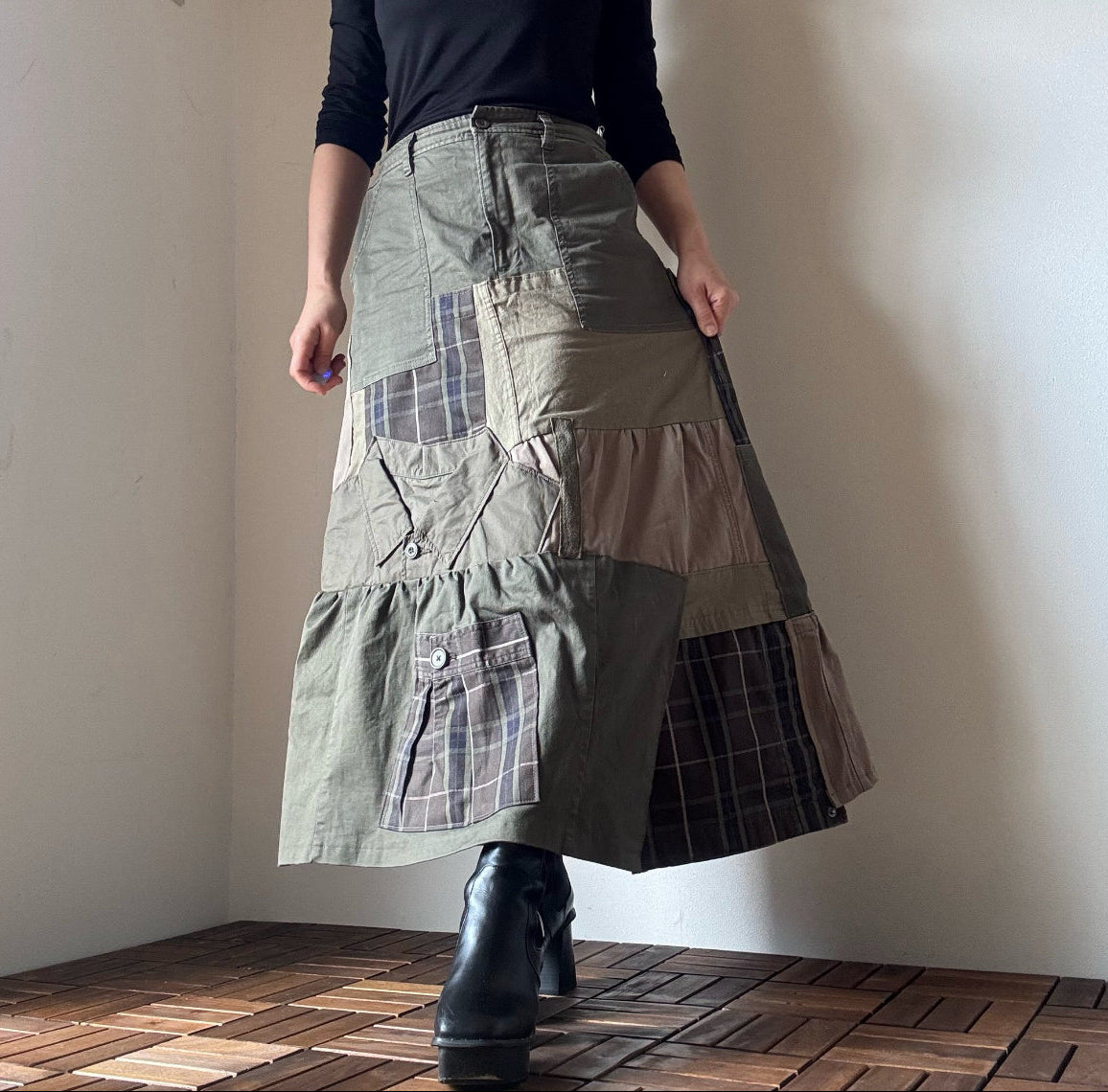 Upcycled Patchwork Maxi Dress – Reconstructed Beige & Plaid One-of-a-Kind Piece