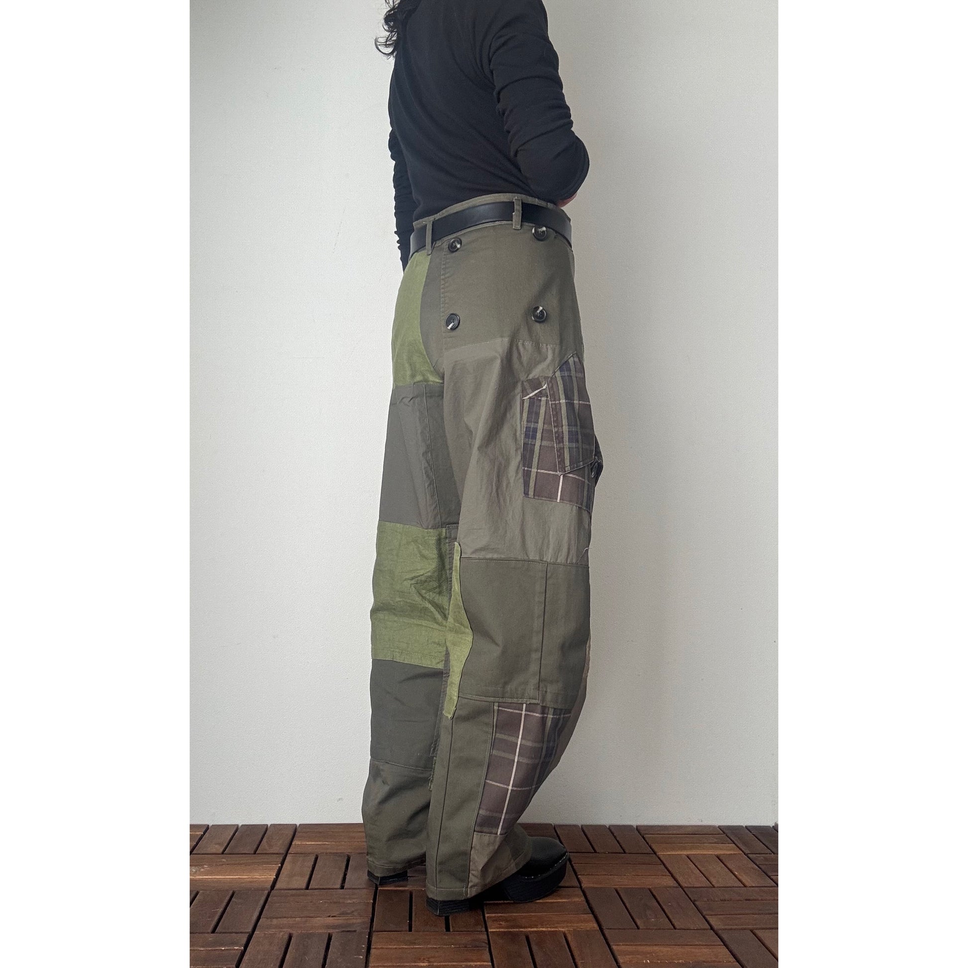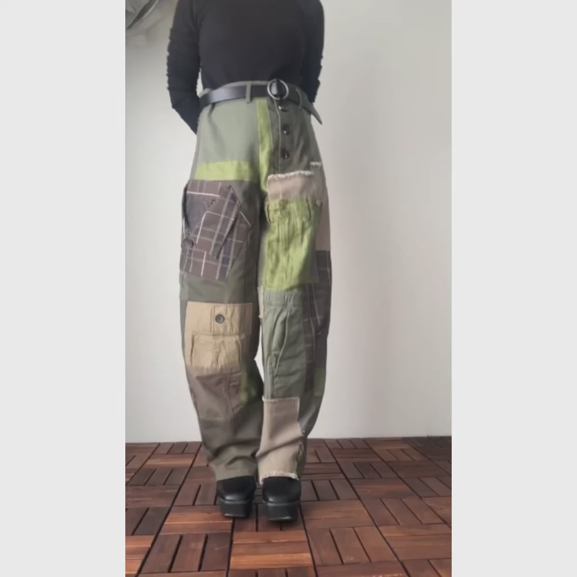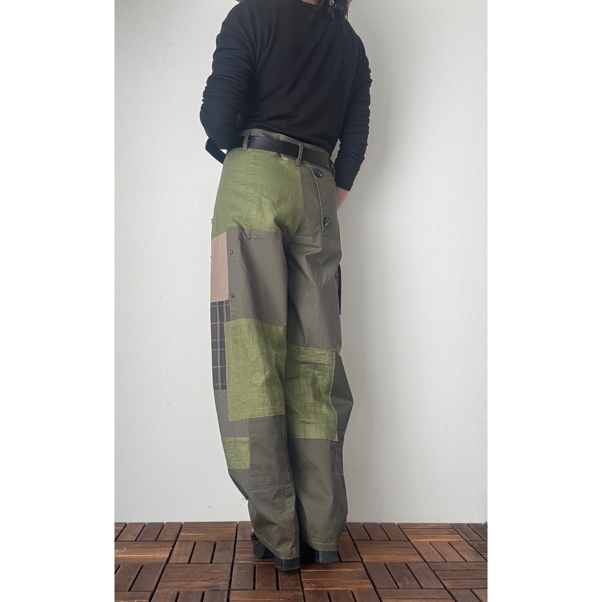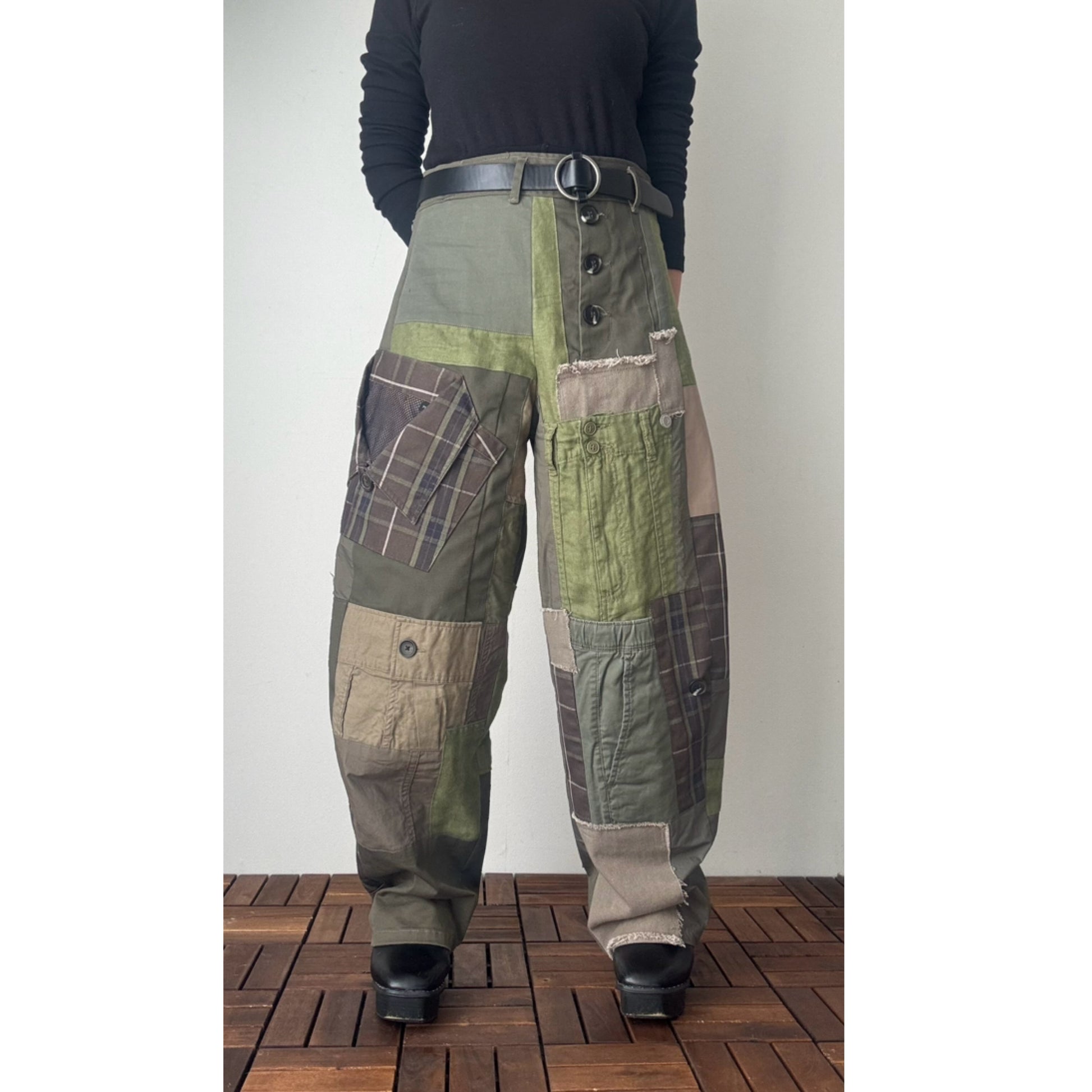 Upcycled patchwork pants crafted from preloved cotton garments in layered shades of khaki and olive. The rounded, voluminous silhouette creates a playful yet relaxed look, balanced with military-inspired details such as visible seams and raw edges. A soft fusible interlining has been added to enhance comfort and durability while preserving the handmade character. Designed for all-season wear, this is a one-of-a-kind piece handmade in Japan.