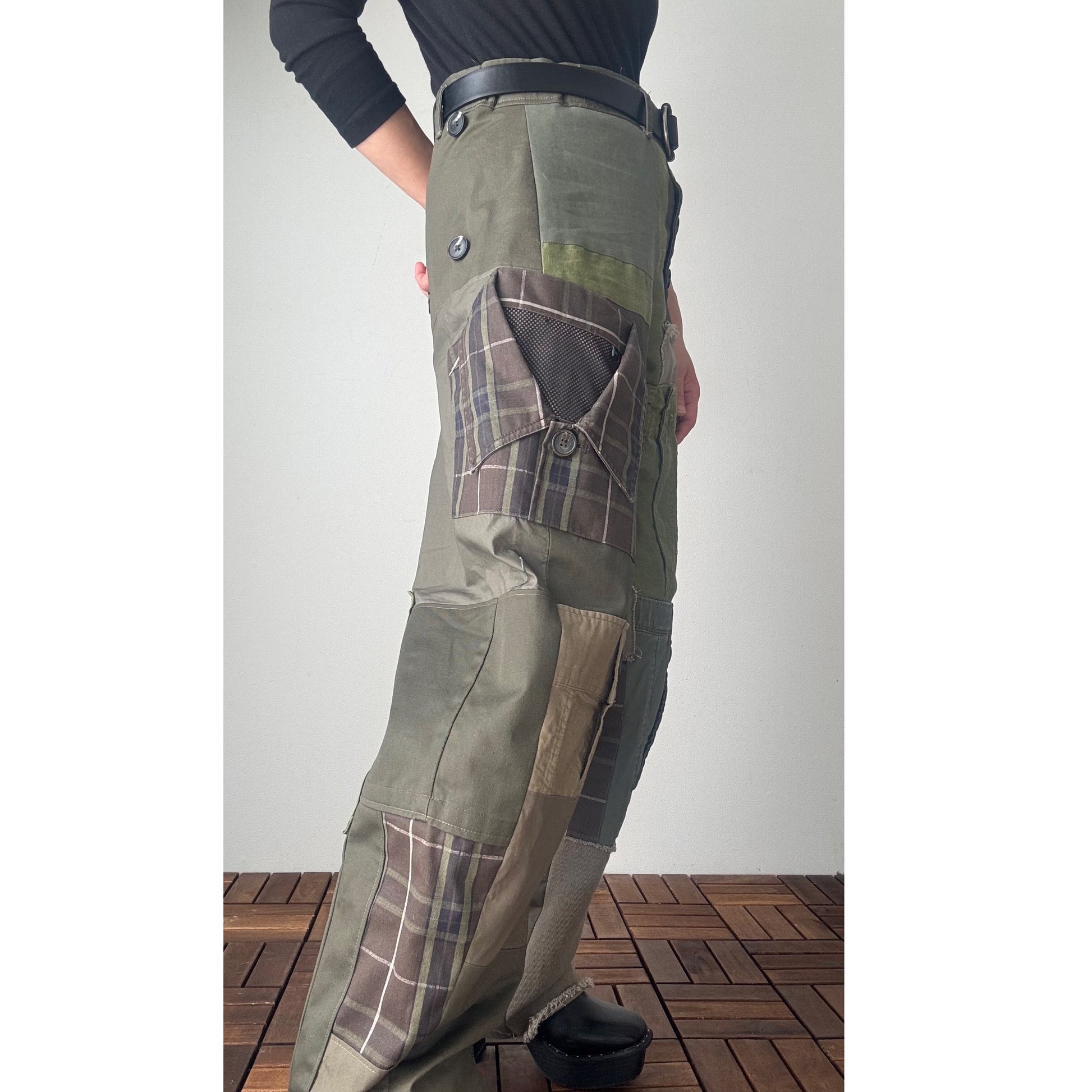 Upcycled Khaki Patchwork Pants, Balloon Silhouette Olive Green Trousers, Handmade Reworked Cotton Linen, One of a Kind