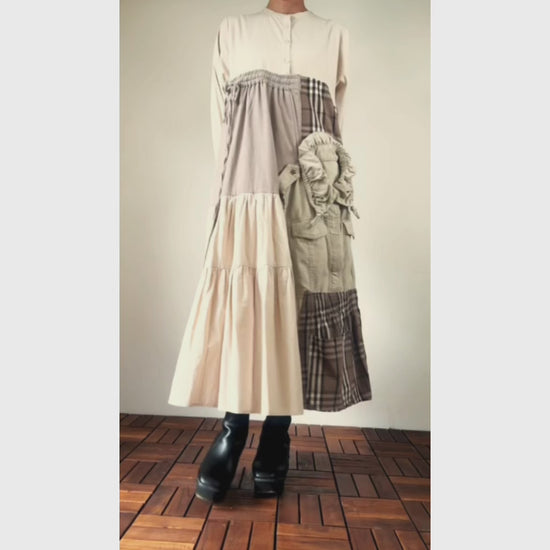 Lovingly handcrafted in Japan from carefully selected secondhand garments, this mid-length dress blends earthy tones, soft textures, and a relaxed silhouette with subtle utility-inspired details.