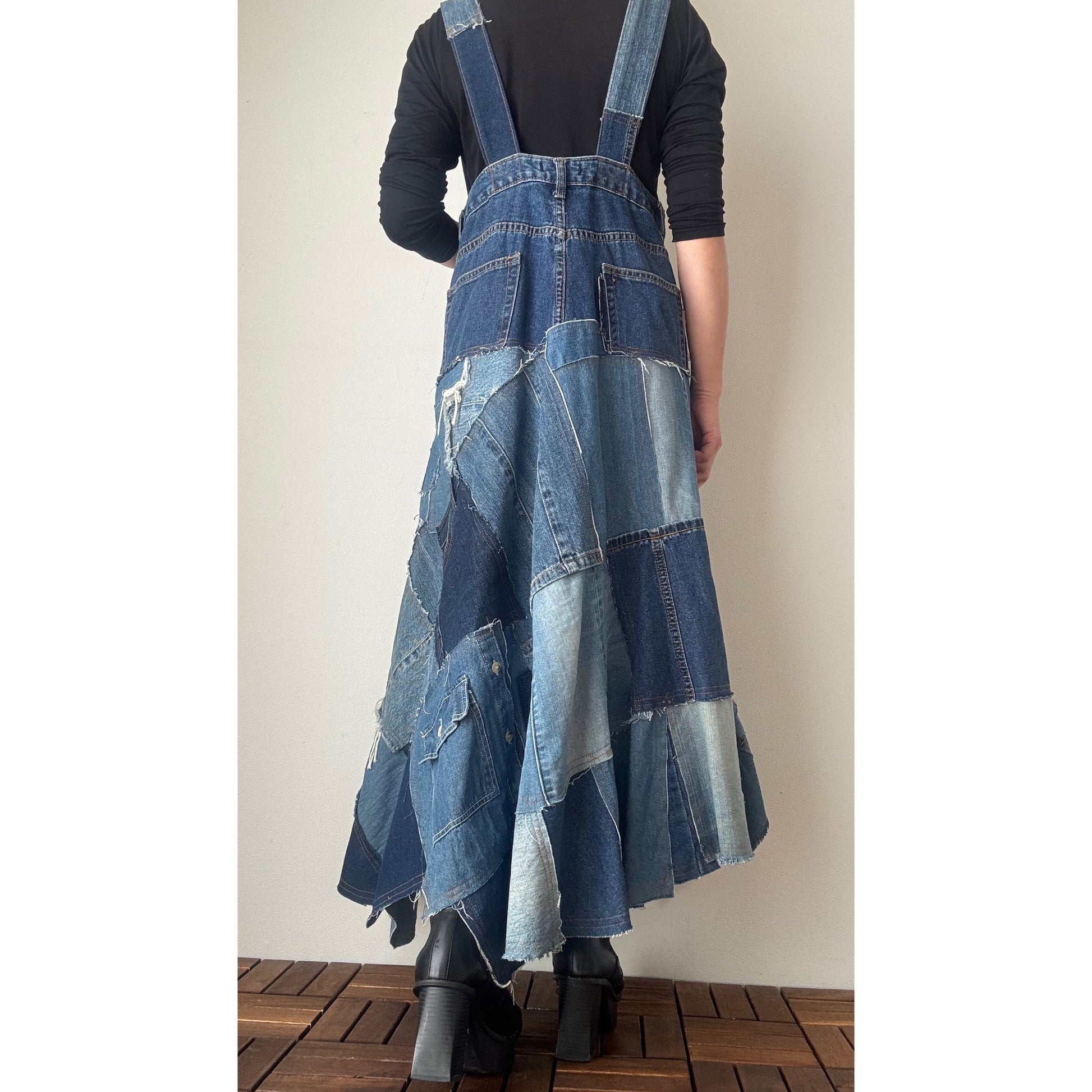 Upcycled Denim Patchwork Jumper Dress – Reconstructed A-Line One-of-a-Kind Piece