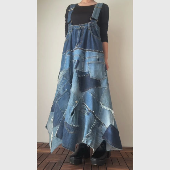 This one-of-a-kind maxi overall dress is handmade in Japan from upcycled vintage denim.