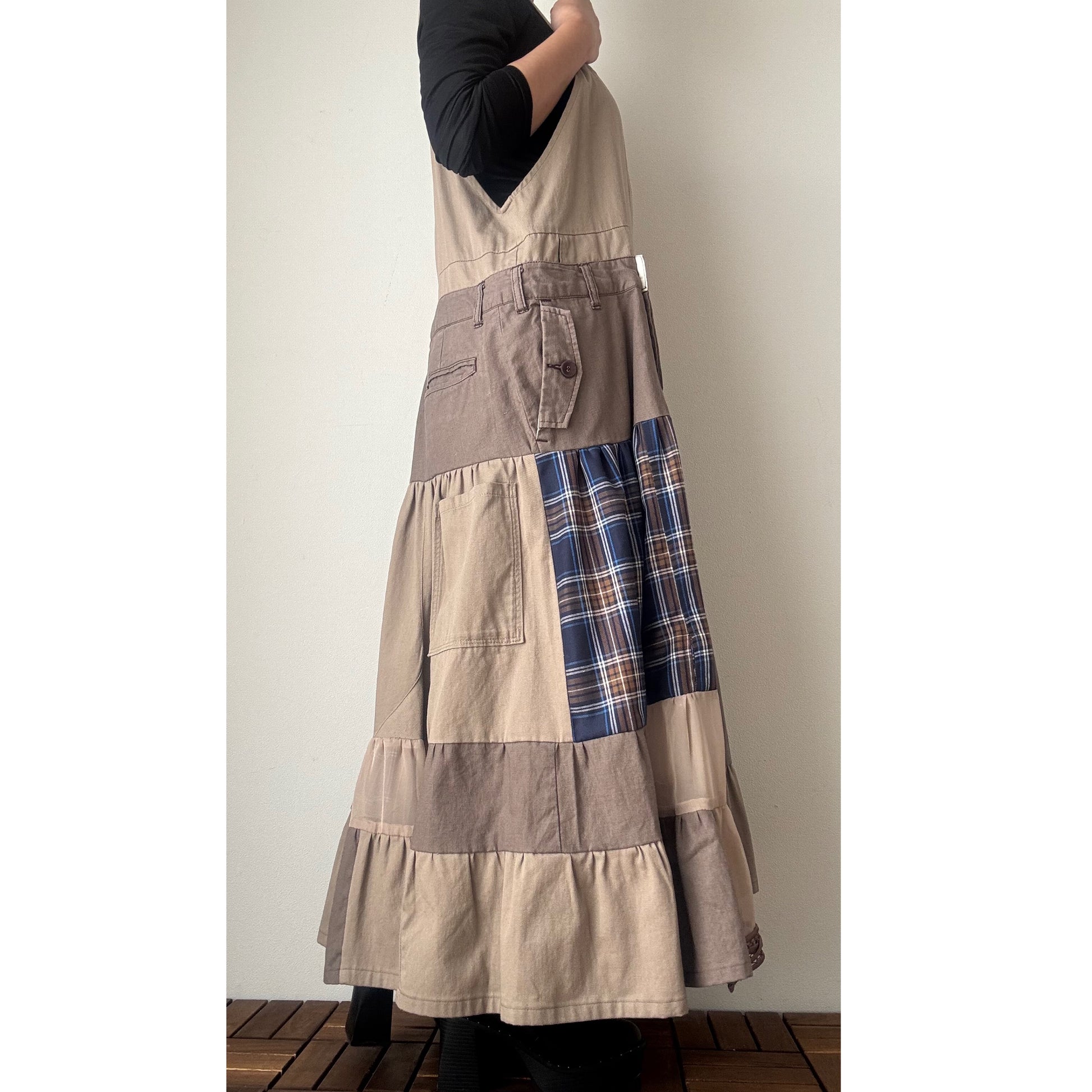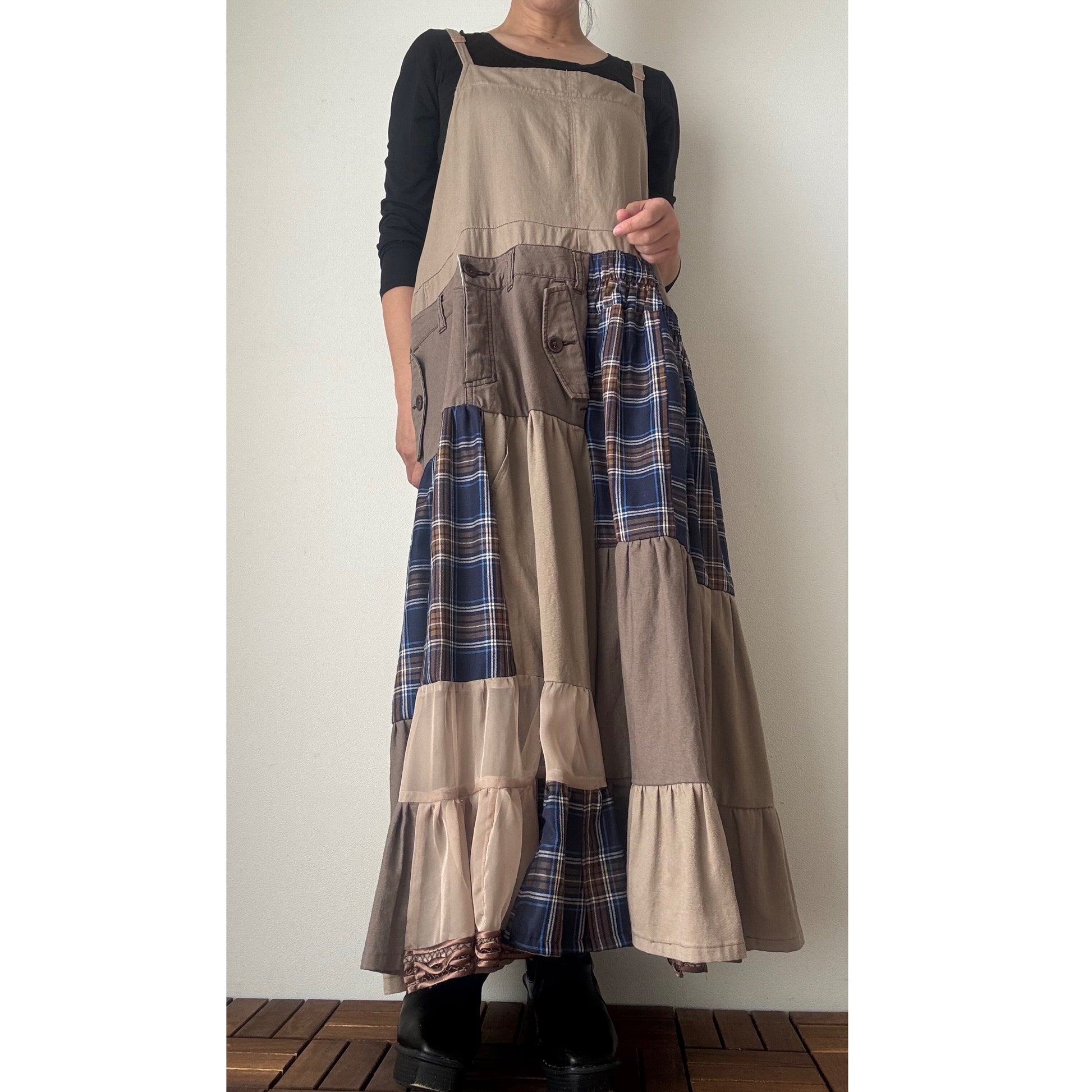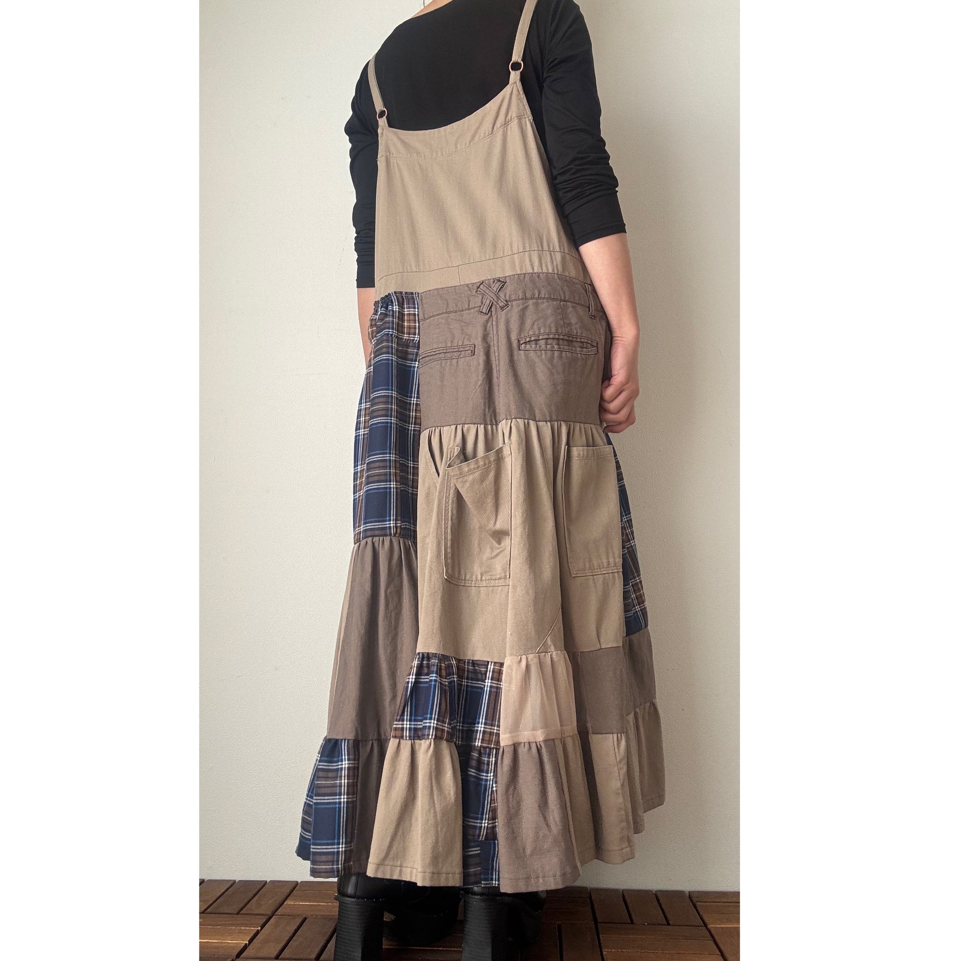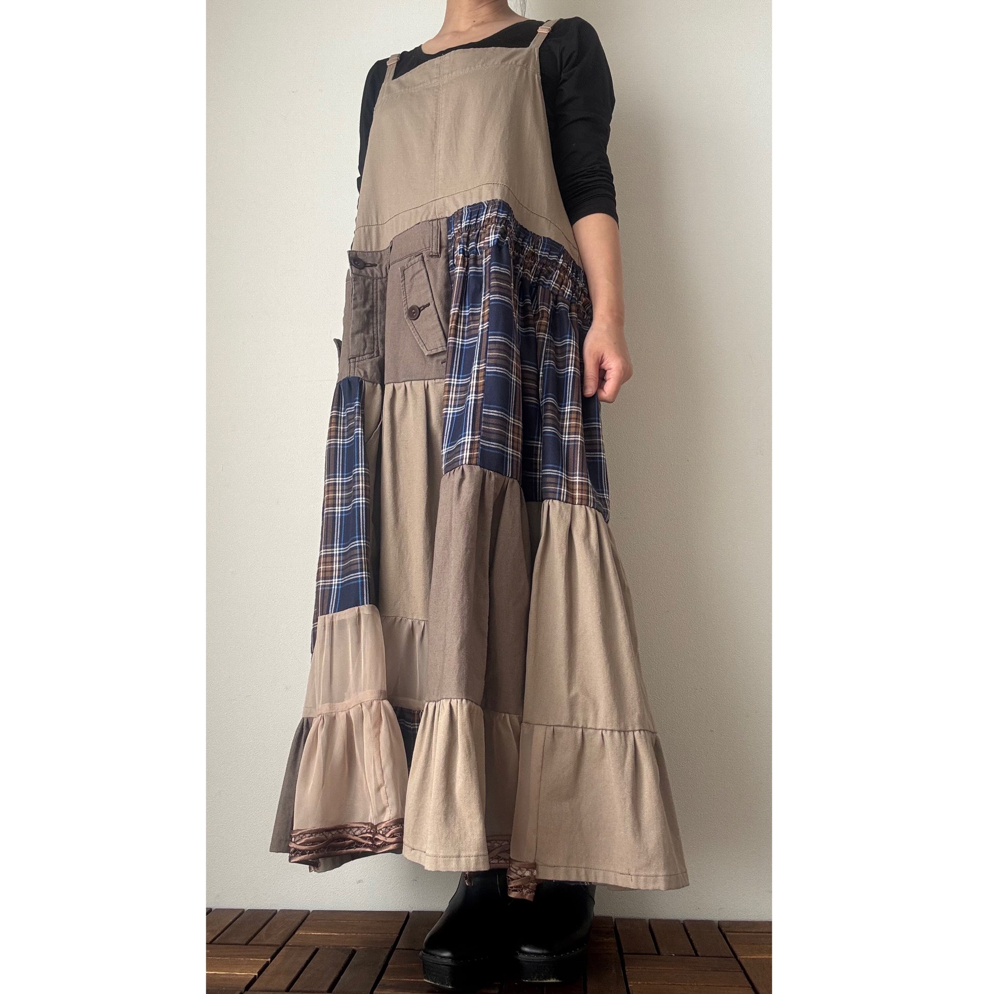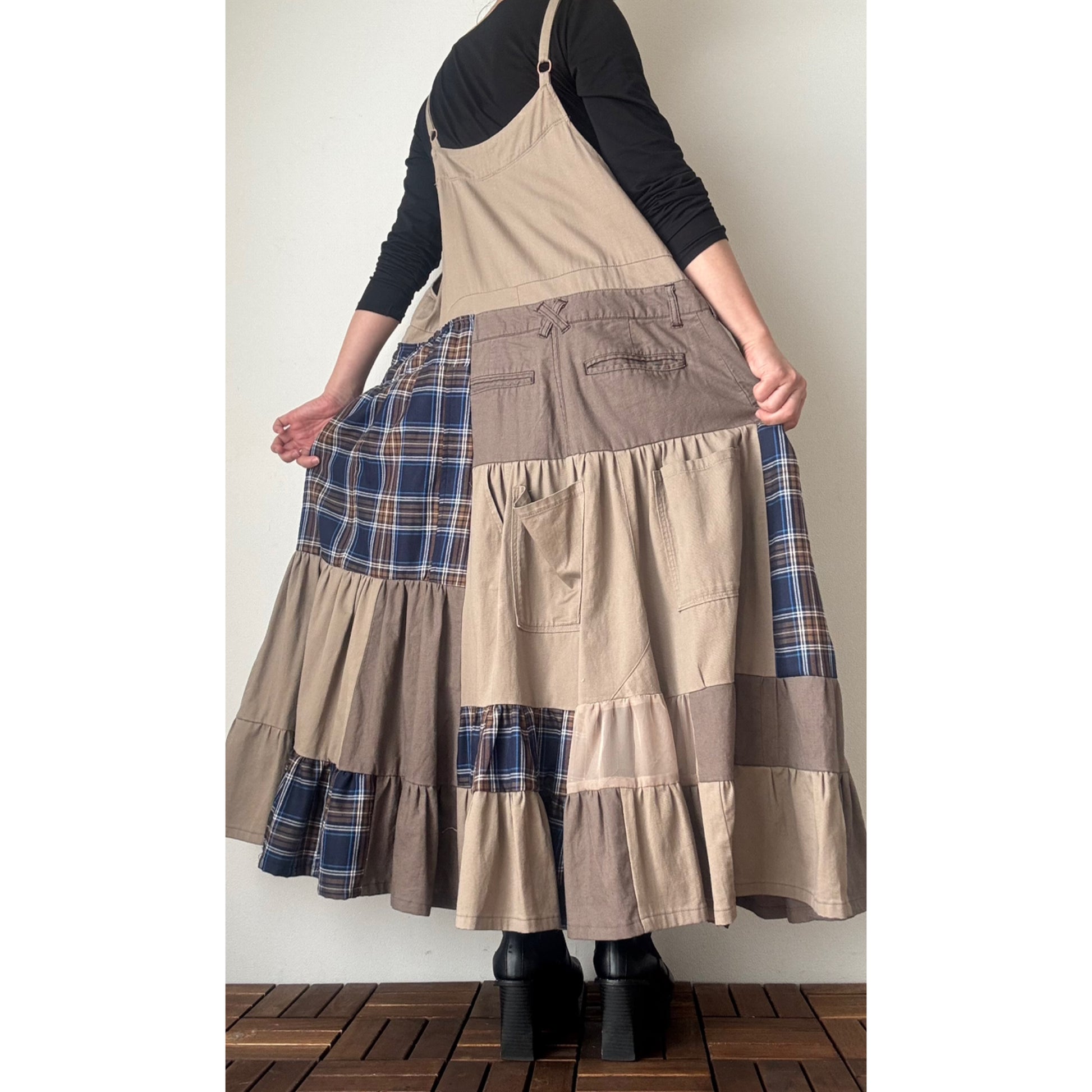 This one-of-a-kind upcycled jumper dress features a patchwork of beige and navy plaid with a voluminous tiered silhouette. Sheer fabric accents add a light, modern touch. The adjustable straps make it easy to style and layer. A unique piece for those who love sustainable fashion.