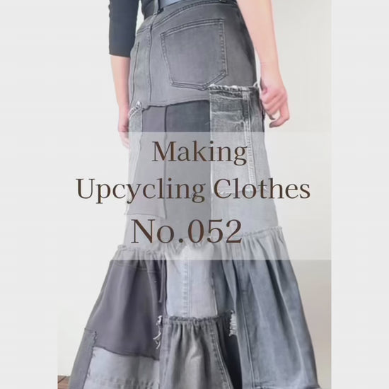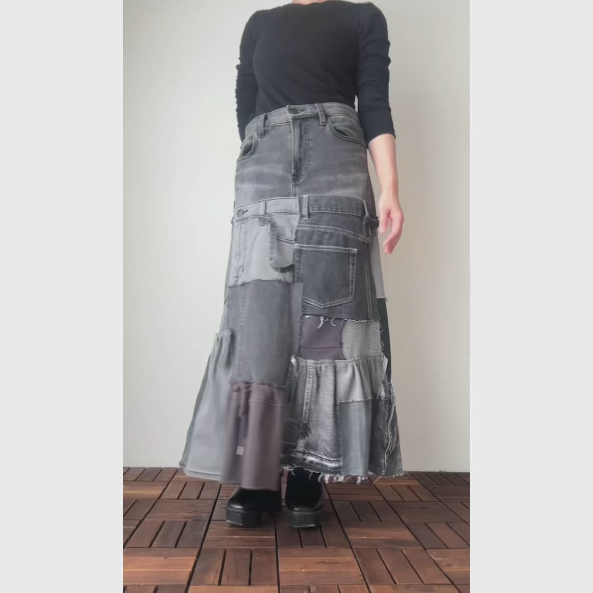 Upcycled Gray Denim Patchwork Long Skirt / Reconstructed Jeans Maxi Skirt / One-of-a-kind Handmade Upcycled Clothing