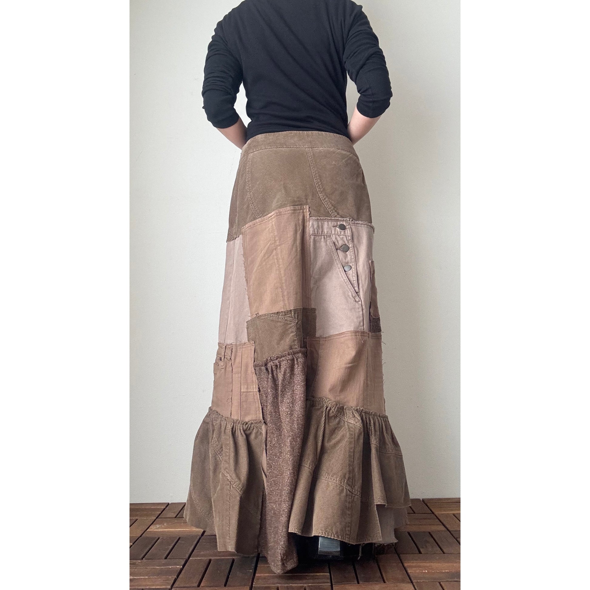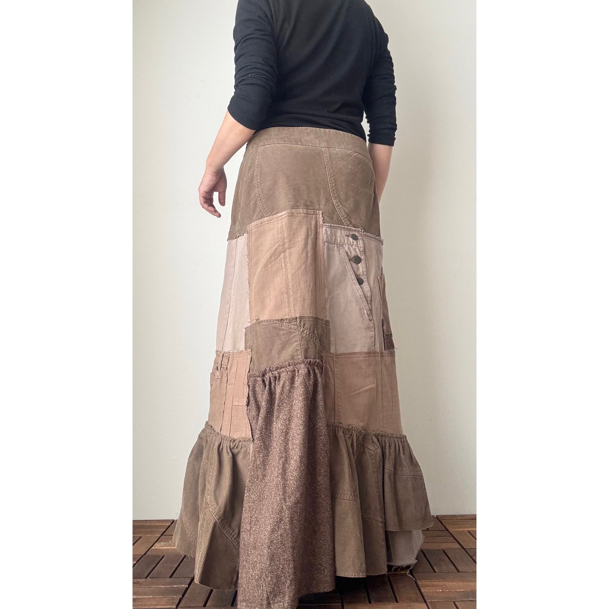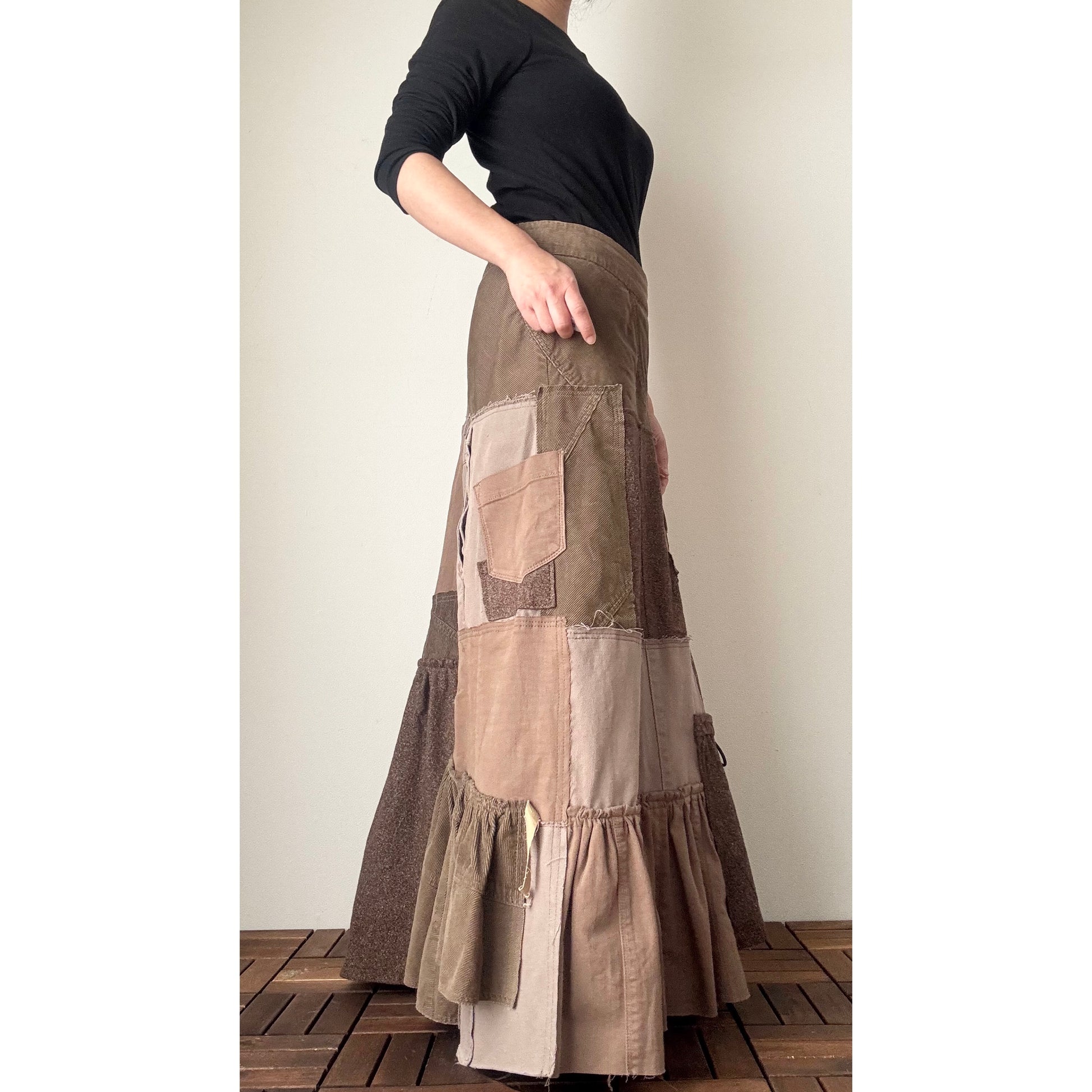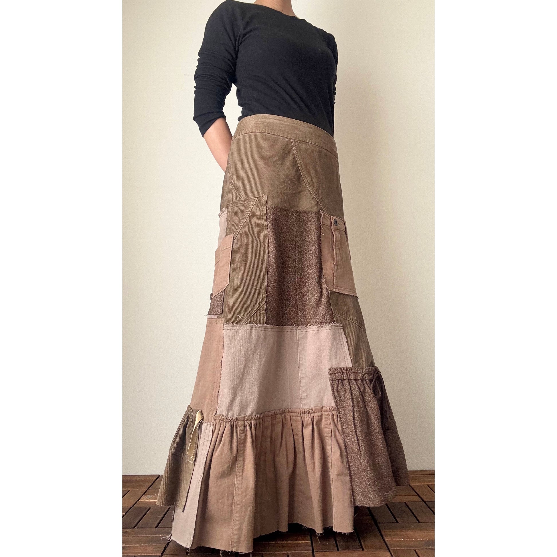 This one-of-a-kind patchwork maxi skirt is handcrafted from carefully selected second-hand denim, skirts, tweed, and corduroy in warm brown tones. Each panel is cut and pieced together by hand, creating natural depth and a quiet, understated elegance. The mermaid-inspired silhouette flares gently toward the hem, with soft gathers that sway beautifully as you walk. Perfect for autumn and winter, this skirt combines comfort, warmth, and timeless slow-fashion craftsmanship.